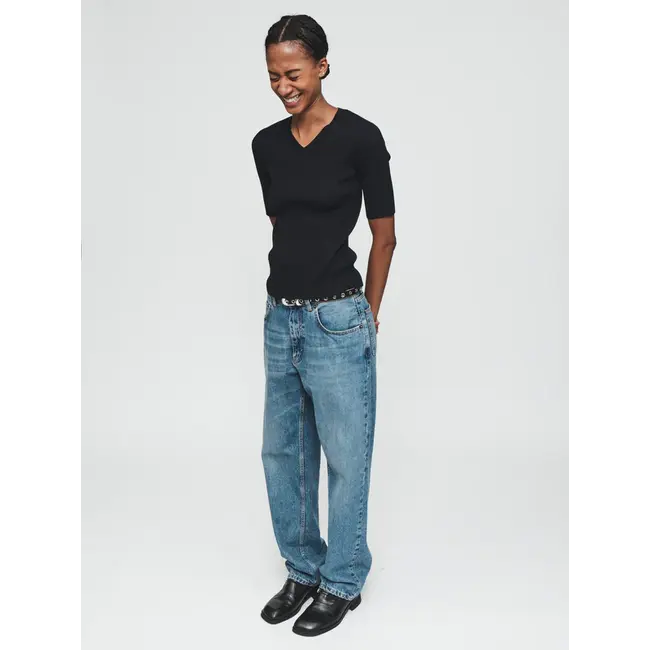 The Pitched Baggy is a slouchy, relaxed fit jean. It has a loose thigh and leg that tapers slightly to the bottom opening, is full length and should stack a bit at the bottom. Slightly higher rise in the back (hence the name "Pitched"). Mid rise.