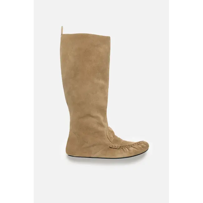 Slouch saddle boots crafted from soft suede, featuring a front saddle strap and a branded leather tag on the shaft. Softly constructed with a flexible polyurethane sole for comfort.