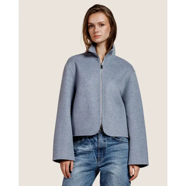 This cropped jacket features a sleek, minimalist silhouette with a structured feel. Designed with a high stand collar and a full-length front zipper, it offers a modern and refined look.