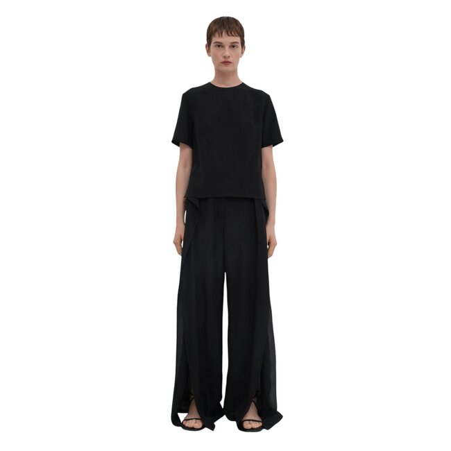 The Tanto Short Sleeve Top in black is crafted from crushed viscose, giving it a distinctive wrinkled texture that is part of its natural character. Designed with a clean silhouette and subtle side slits