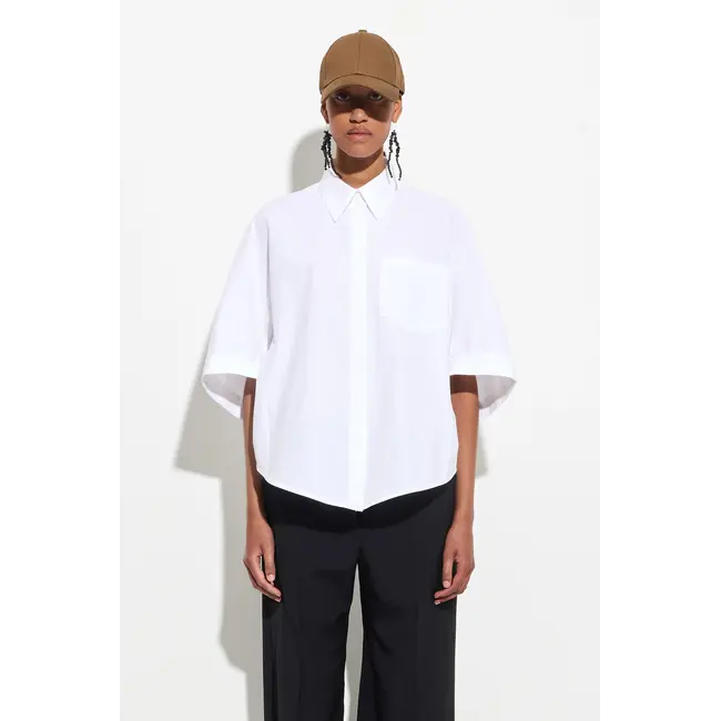 A boxy, oversized shirt in pure cotton poplin, defined by its wide short sleeves, sharp collar, and clean concealed placket. The crisp white fabric holds its structure yet feels airy and easy on the skin.