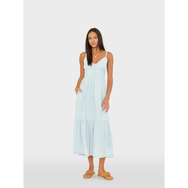 Vacation Mode. Greta is new this season in our lightweight, soft-woven cotton chambray in a classic light blue wash. This button-front midi dress features a V-neck, adjustable straps, fitted bodice, tiered skirt, side seam pockets, and a smocked back.