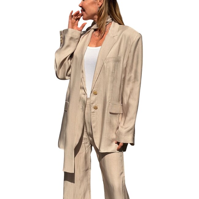 Single-breasted suit jacket crafted from fluid twill with a seasonal check pattern, featuring a built-in scarf detail. Designed with shoulder pads, a two-button closure, a chest welt pocket, and front flap pockets. Cut to a regular fit and hip length.