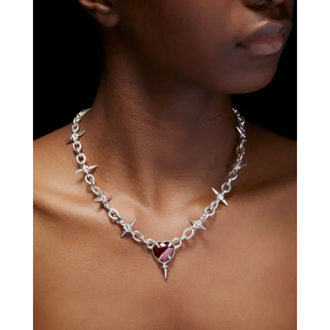 A necklace imbued with timeless drama and captivating beauty. Drawing from the twin emotions of joy and sorrow found in a poignant folktale. Sharp spikes encircle a blood-red garnet heart – a powerful duality that represents the journey she goes on.