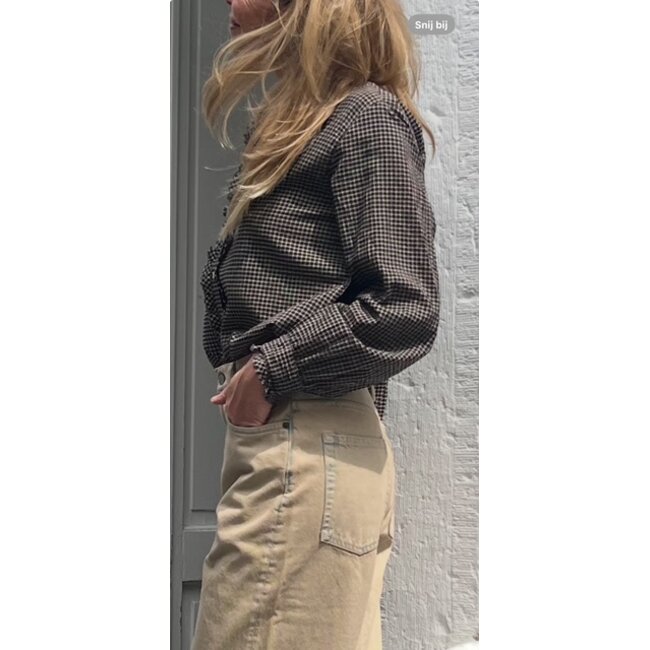 Checkmate. Amelie is new this season in our cotton gingham check with added stretch for ease of comfort. This button-front shirt features raw edge ruffle details throughout the neck, front placket, and cuffs.